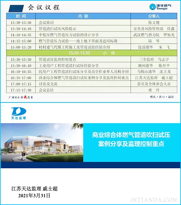 天达监理公司各港华监理部均在所在的港华合资公司会议室集中观看了本次视频会议。会上,苏州分公司戚士超副经理代表天达监理公司作了题为《商业综合体燃气管道吹扫试压及监理控制重点》的案例分享,介绍了我公司港华监理部在大型商业综合体吹扫试压中的经验做法、控制重点,得到了集团领导和与会单位的一致认同,也借此机会展示了天达监理专业化的服务水平,树立了公司在港华集团中的品牌形象。