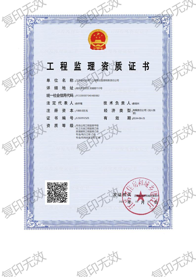 5月20日,天达监理公司成功取得江苏省住房和城乡建设厅下发的电力工程和机电安装工程监理乙级证书,标志着公司在进一步提升市场竞争力,推动公司生产经营持续发展的道路上又走出了坚实一步。
