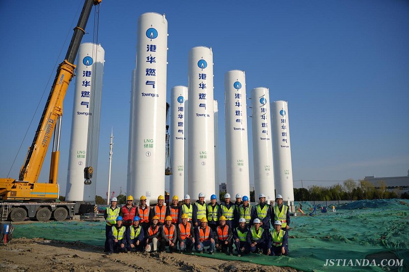 200m3LNG立式储罐是项目核心设备之一,储罐长24.725米,外径3.94米,净重约为60.05吨,在主吊600吨和溜尾220吨汽车吊的配合下,最大起升高度超过40米,经过储罐与地脚螺栓精确对正、固定,经纬仪测量垂直度等工作,最后由一台30吨吊车协助完成设备脱钩,一台储罐吊装用时约为45分钟。